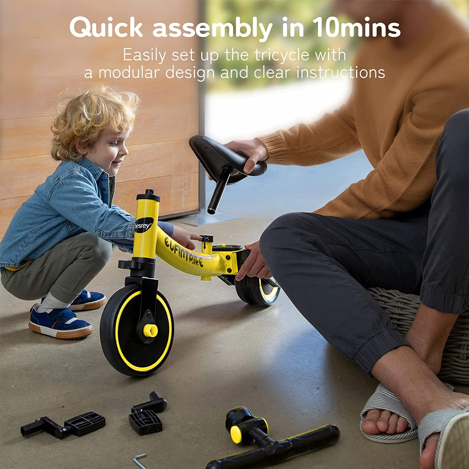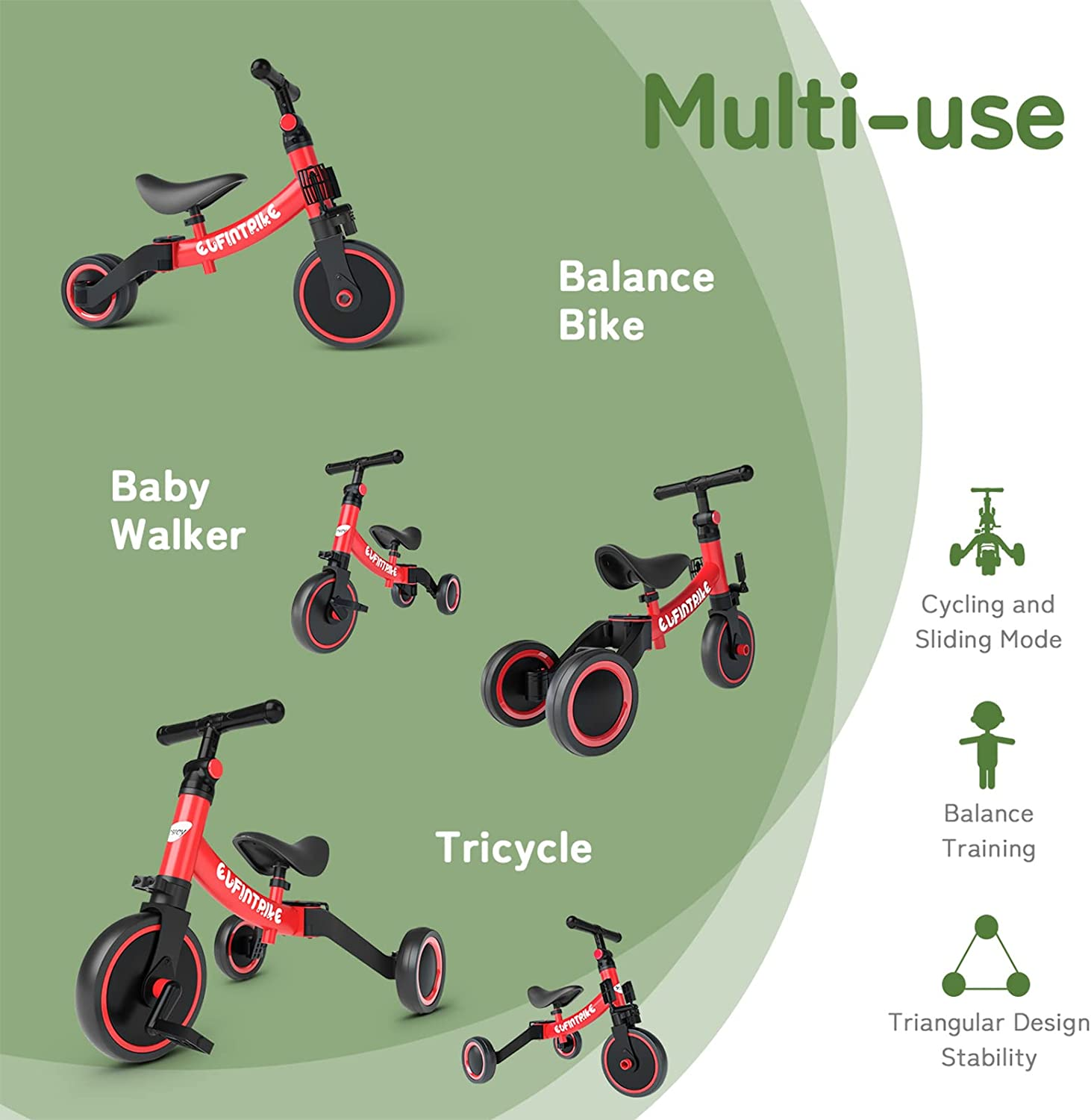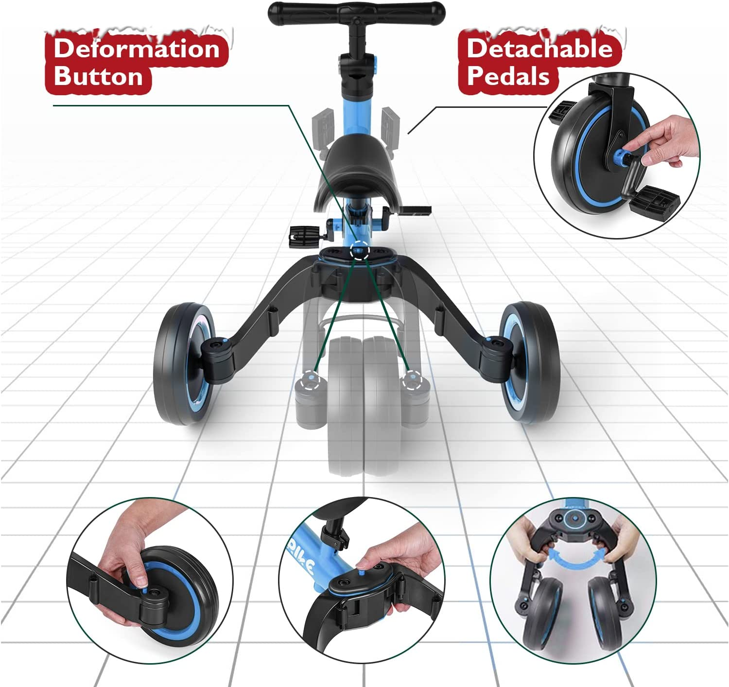 • ?5 en 1 velo enfant : Mode coulissant à trois roues(grand/petit angle, pour coulisser)、Mode tricycle à pédale(grand/petit angle, apprendre à rouler)、Mode draisienne à deux roues(apprendre à marcher)