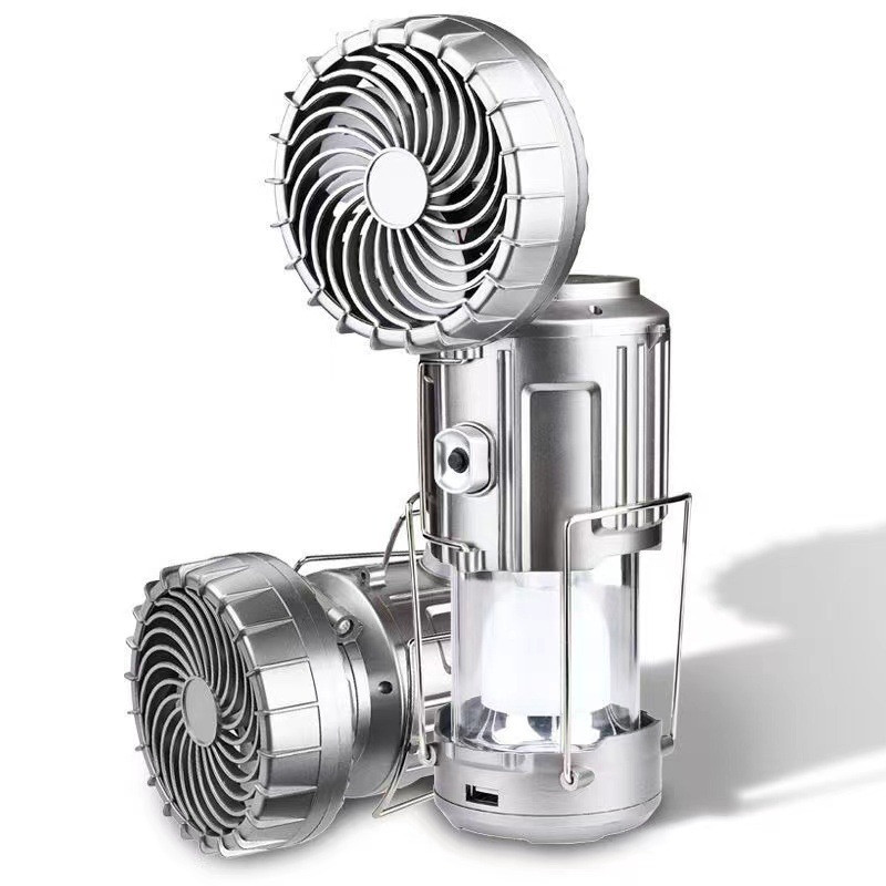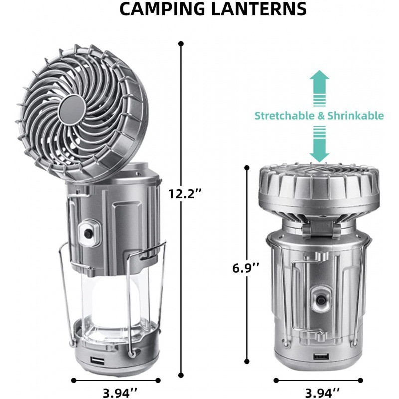 Lampe de camping multifonctionnelle avec ventilateur, éclairage solaire, lampe de chevet, lampe de poche, power bank, chargeur portable pour la batterie.