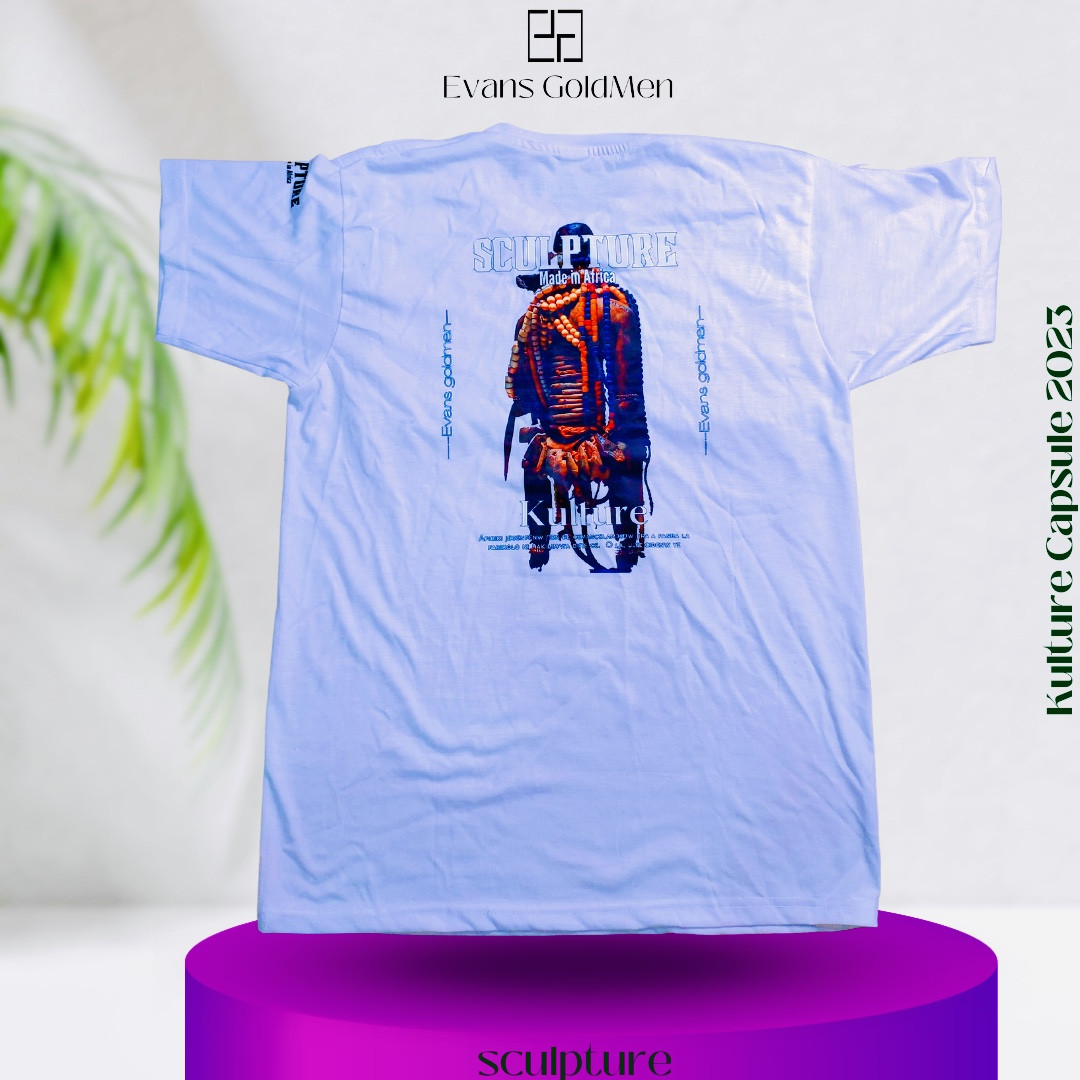 SCULPTURE est un imprimer de t-shirt issue de la collection «Kulture 2023 » de la marque Evans GoldMen. Fabriqué avec du cotton peigné du Bénin et embellit avec des fibres de laine donnant ainsi un côté artistique de ce dernier. Existant en deux coloris (noir et blanc)