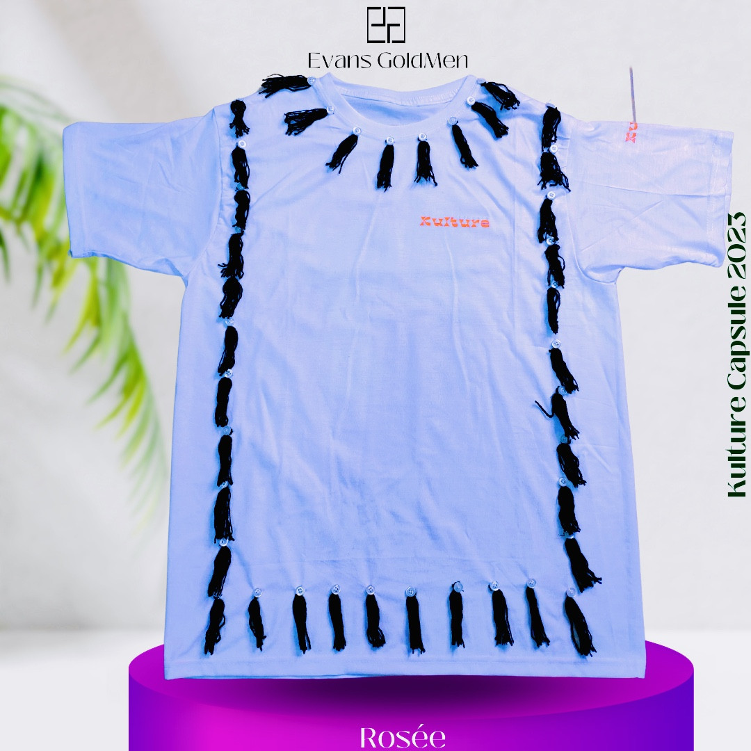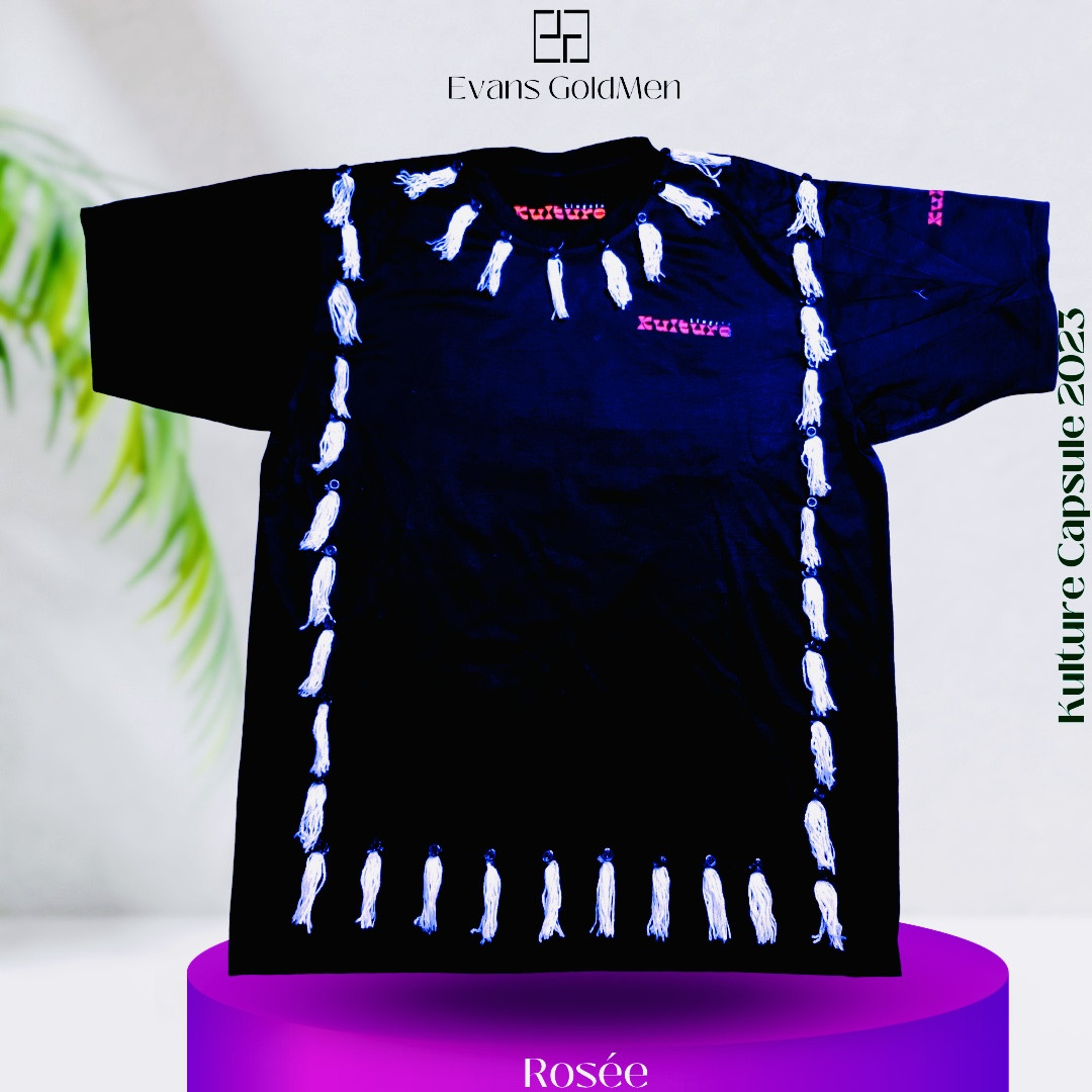 TRADITION est un imprimer de t-shirt issue de la collection «Kulture 2023 » de la marque Evans GoldMen. Fabriqué avec du cotton peigné du Bénin et embellit avec des fibres de laine donnant ainsi un côté artistique de ce dernier. Existant en deux coloris (noir et blanc)